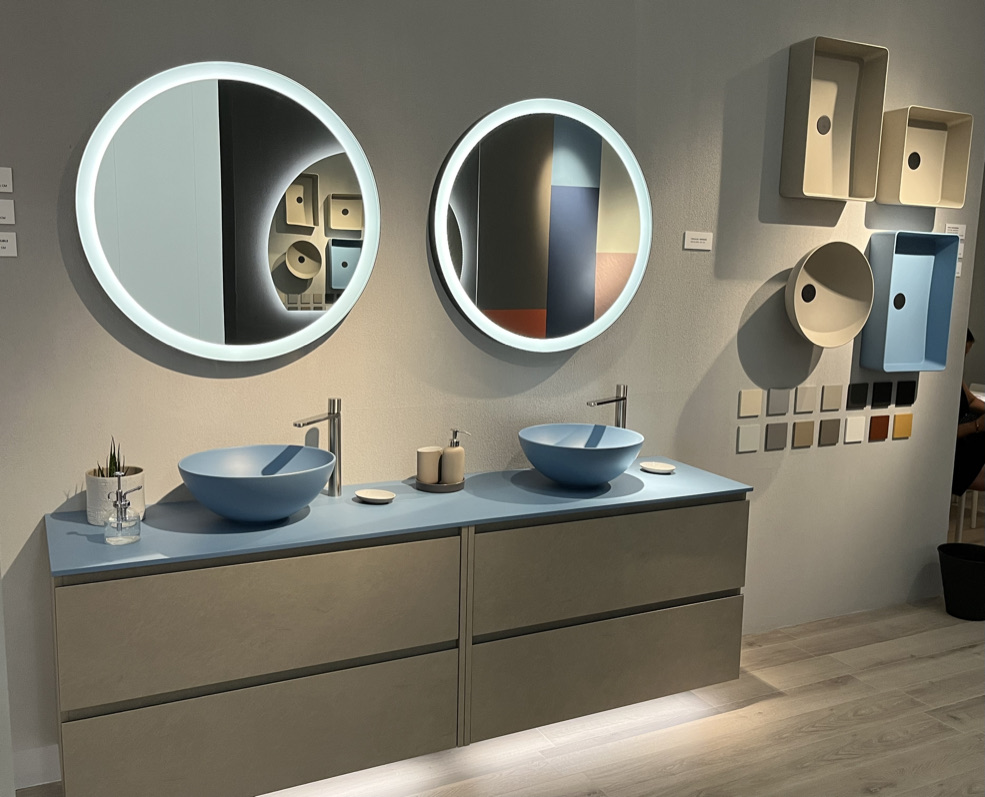 The corner in which we have exhibited the new range of washbasins has attracted attention for its colour, a RAL 5024 blue that has been the subject of compliments. The bathroom furniture and mirrors have also attracted attention in this space, two novelties for our next catalogue which, like all our products, can be customised in terms of dimensions and finishes, always with the maximum quality that characterises us.