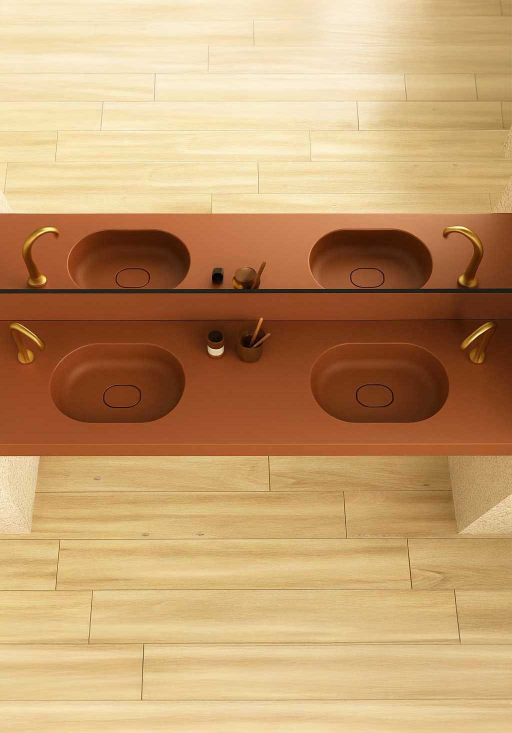 The Lounge counter basin in special colours —Fossil, Gold and Terracotta— transforms its soft, minimalist shape into a design piece with great personality. Ideal for classic bathrooms looking for a modern twist, its smooth basin and the textures available in Liso (smooth) or Pizarra (slate) further enhance its sophisticated aesthetics. It can be installed suspended or on a cabinet, offering functional elegance in every detail.